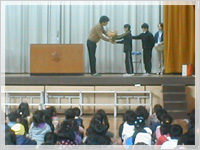 中尾小体育館で行われた朝礼で全校学校保健委員会を行い、歯がなくなるとどうなるか、歯と命そして歯がきれいな人のイメージについてお話ししました。日ごろの感謝として児童からお花を頂きました。感激!!