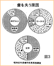 またむし歯と共に歯を失う原因でもあり(図3)、生活習慣病と言われています。歯周病は歯肉だけに炎症のある歯肉炎と、歯を支えている歯槽骨にまで及んだ歯周炎(歯槽膿漏)の二つに分けられます。(図4)予防にはプラークや歯石の除去の他に食活、不規則な生活、ストレス、喫煙、飲酒、歯列不正について注意していく必要があります(環境因子)。